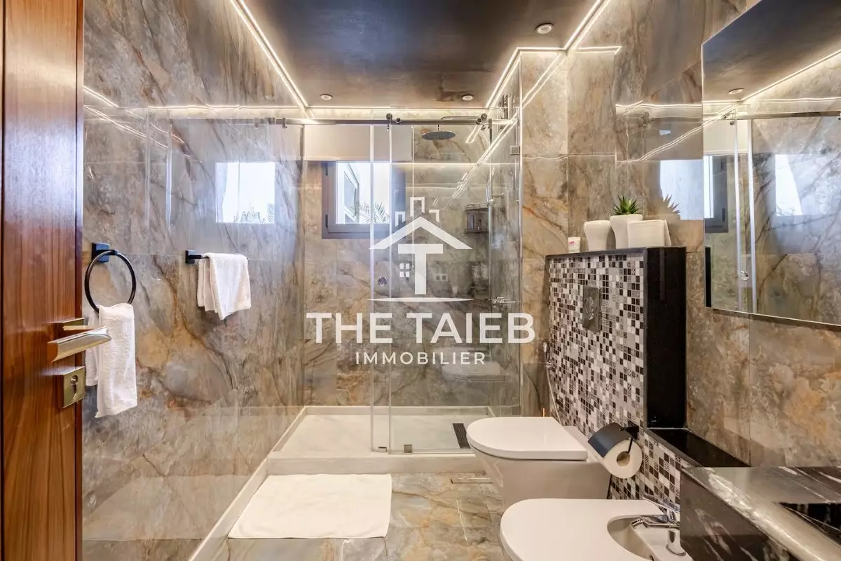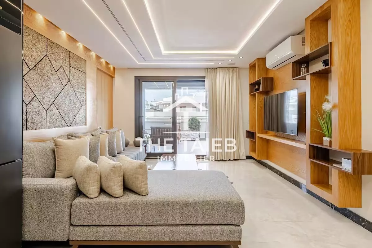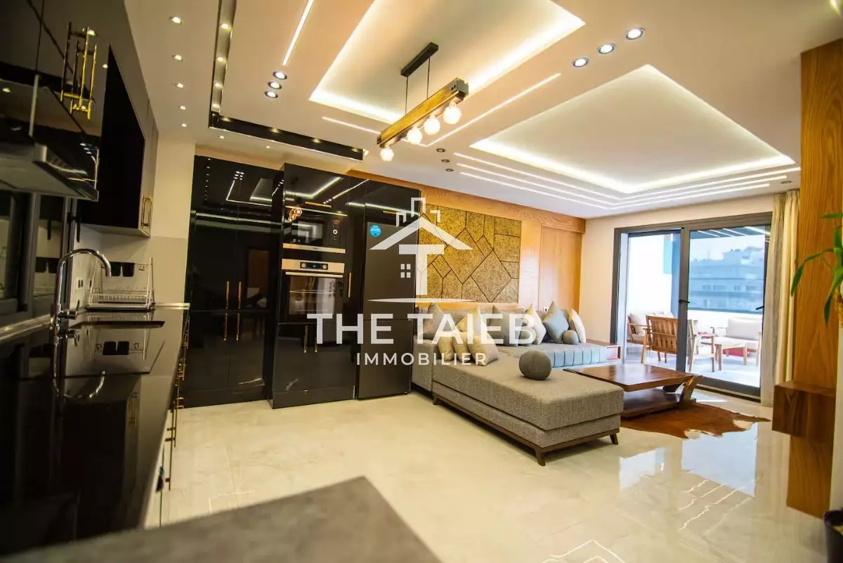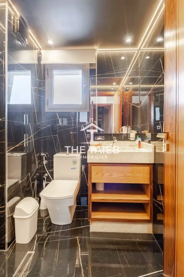 appt 5* Située au 9 ème et dernier étage. * Terrasse de 46 M². * Pergola bioclimatique. * A 1 minute à pieds de la plage, des (Restaurants , bars et toutes autres comoditées. * A 10 minutes à pieds de la gare du train, de la marina et du centre ville. * A 15 minutes du port de tanger ville par taxi. * Linge et serviettes blanc de grande qualité ( service étage à la demande ). * Décoration moderne et équipements neufs du dérnier cri.