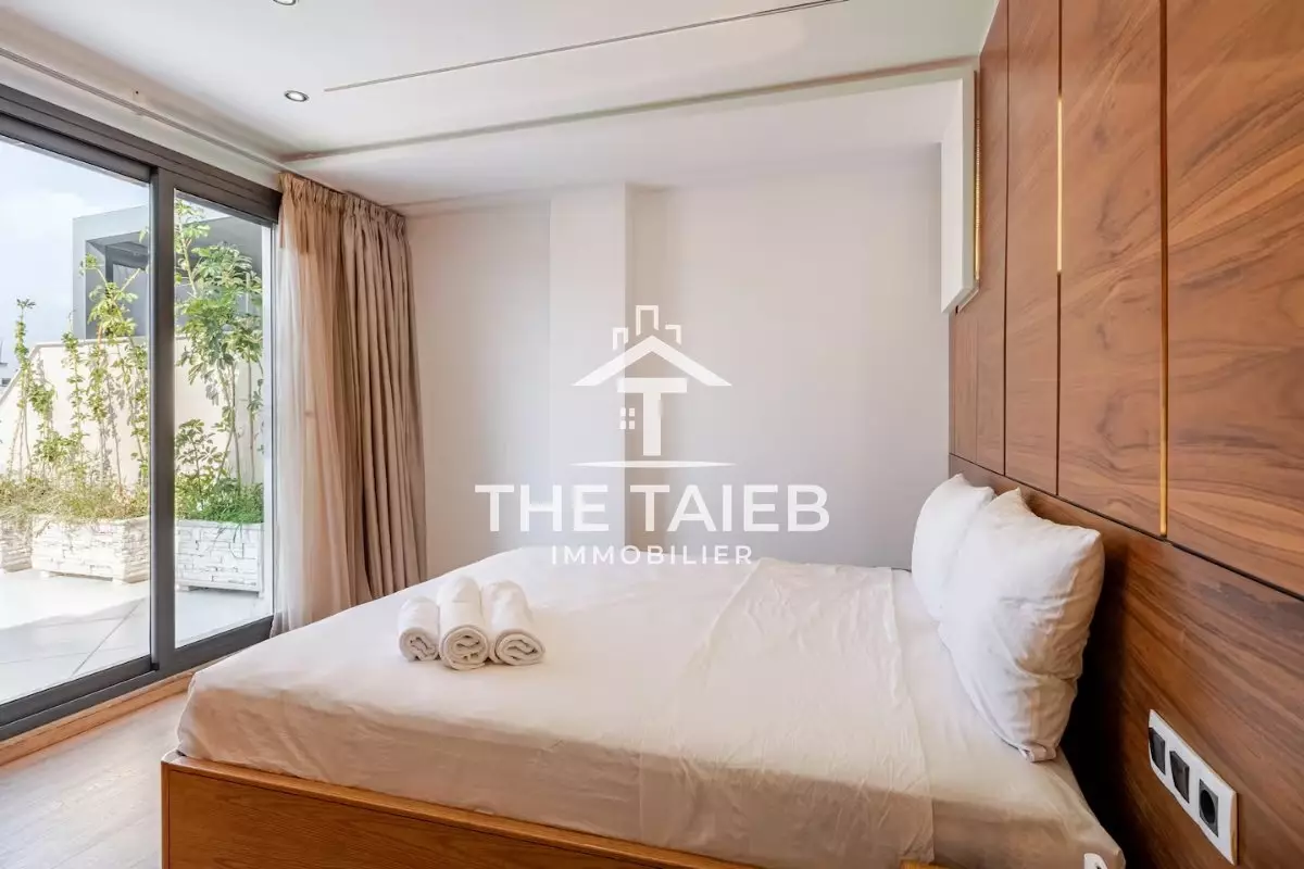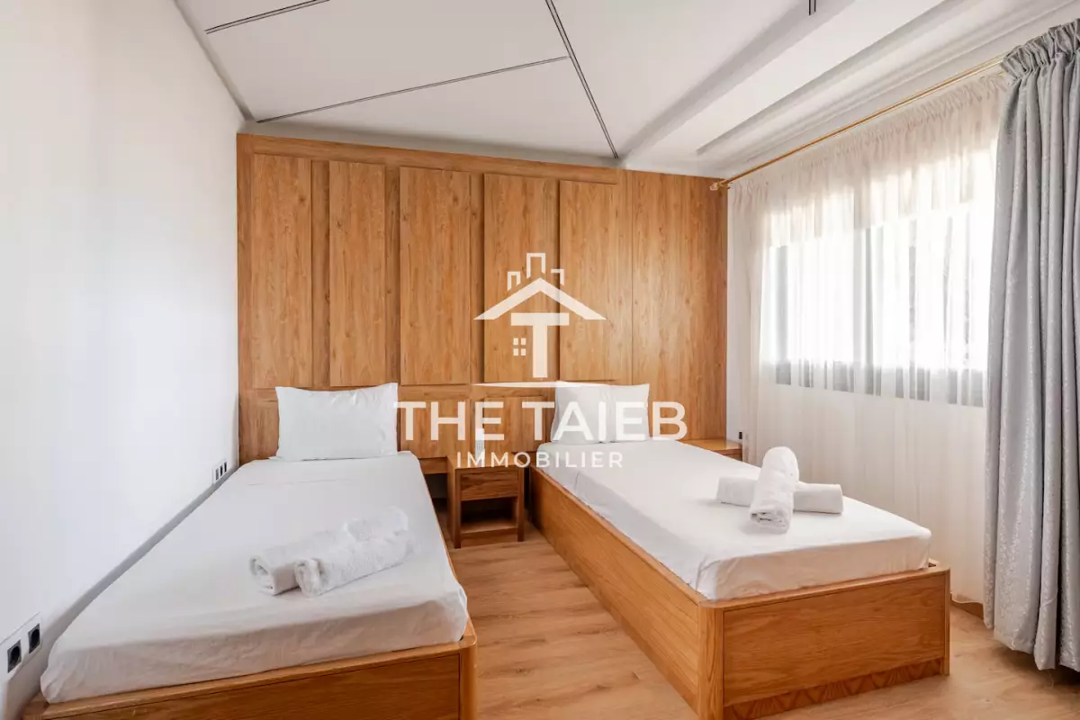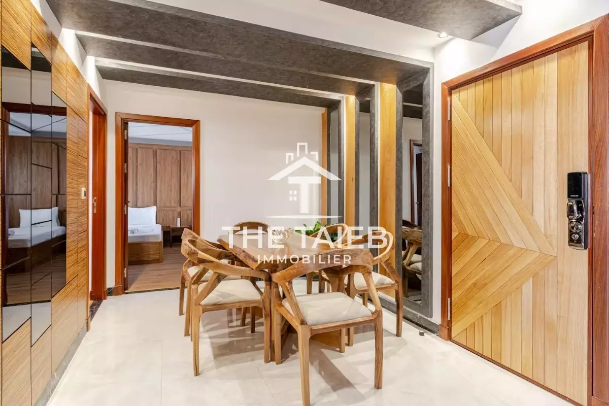 appt 5* Située au 9 ème et dernier étage. * Terrasse de 46 M². * Pergola bioclimatique. * A 1 minute à pieds de la plage, des (Restaurants , bars et toutes autres comoditées. * A 10 minutes à pieds de la gare du train, de la marina et du centre ville. * A 15 minutes du port de tanger ville par taxi. * Linge et serviettes blanc de grande qualité ( service étage à la demande ). * Décoration moderne et équipements neufs du dérnier cri.