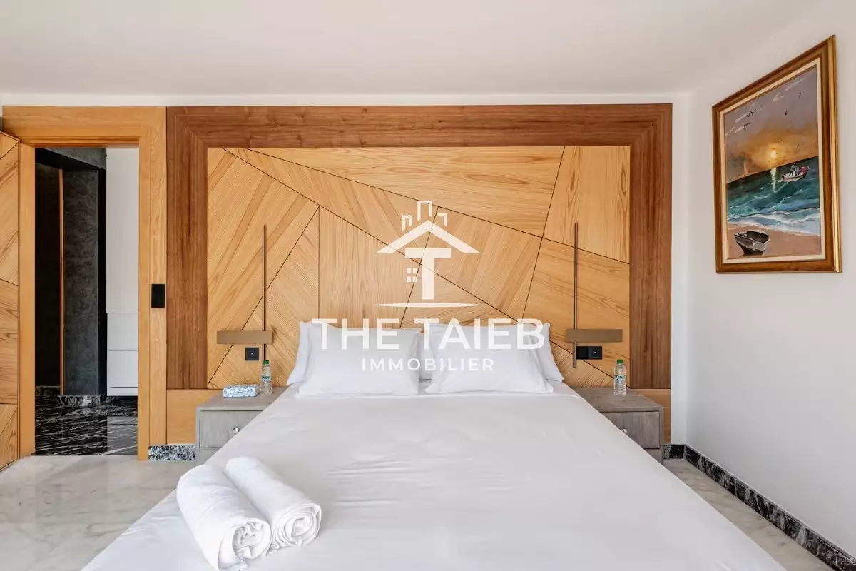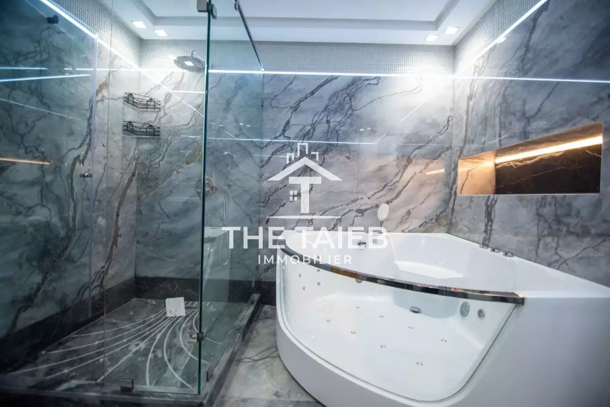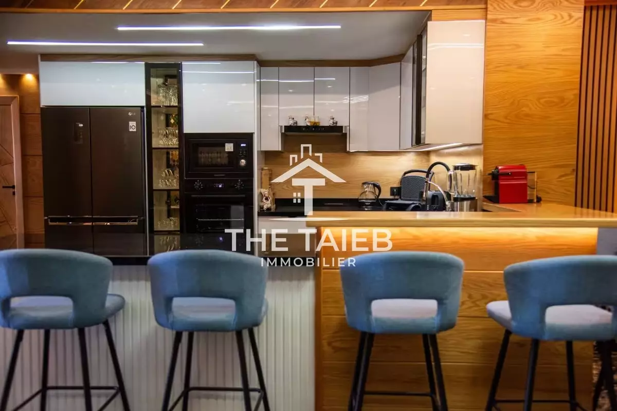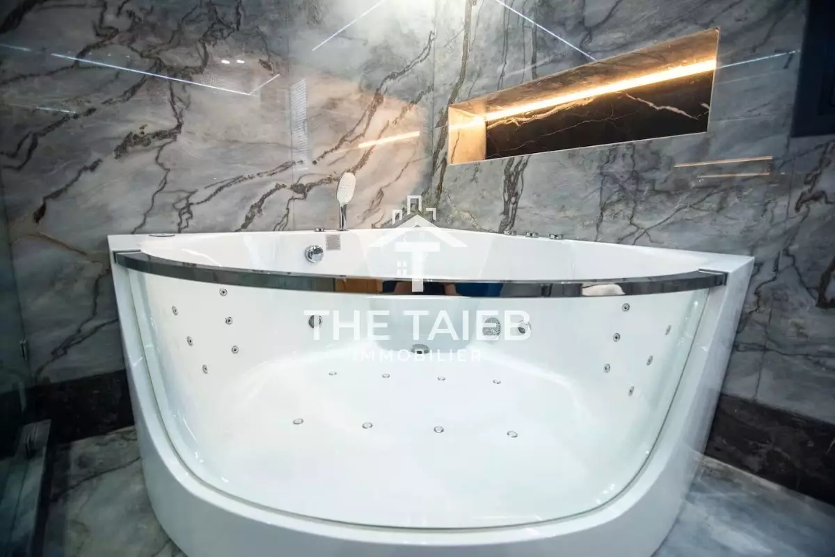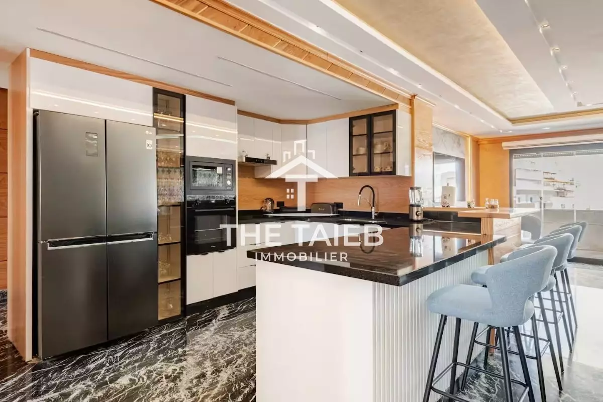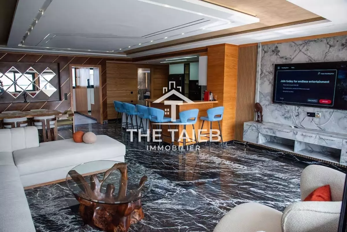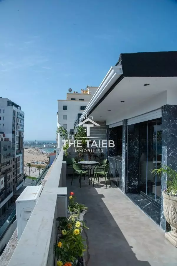 THE TAIEB IMMOBILIER vous présente une appartement Située au 9 -ème et dernier étage. * 3 Terrasses à 360 degré. * Deux suite parentales et une chambre d'enfants. * Un salon à coupé le souffle avec zellij beldi création unique donnant sur deux terrasse des deux cotés et un comptoir de cuisine en bois massif. * Jacuzi dans la salle de bain visiteurs. * A 1 minute de la plage, des (Restaurants , bar .....) * A 10 minutes de la gare du train, de la marina et du centre ville. * A 10 minutes du port de tanger ville par taxi. Le logement À l’intérieur, il comprend deux chambres semblables à des suites royales, chacune équipée d’une salle de bain privative, ainsi qu’une chambre moderne et chaleureuse, idéale pour des enfants ou des invités. Les chambres, entièrement climatisées, sont dotées de murs habillés en bois naturel et d’un éclairage tamisé. Toutes s’ouvrent sur la terrasse grâce à de grandes portes vitrées coulissantes, offrant une vue exceptionnelle. La pièce de vie principale est un chef-d’œuvre avec un salon décoré de zellige traditionnel moderne et un comptoir-bar en bois naturel, ajoutant une touche d’élégance. La cuisine américaine, parfaitement intégrée, est équipée d’appareils électriques haut de gamme et de haute qualité, conçue pour allier esthétique et fonctionnalité. Le sol de l’appartement est une véritable œuvre d’art en marbre noir aux veines blanches harmonieuses. Une salle de bain pour invités propose un jacuzzi pour deux personnes, avec une ventilation naturelle et une excellente exposition au soleil. L’appartement bénéficie également d’une lumière naturelle exceptionnelle, baignant chaque pièce de six heures du matin à cinq heures de l’après-midi, sans nécessiter d’éclairage artificiel.