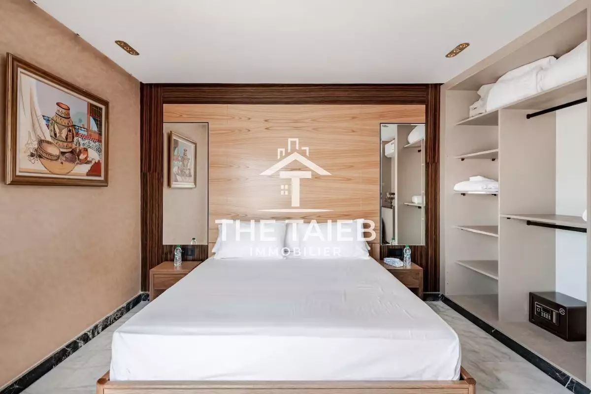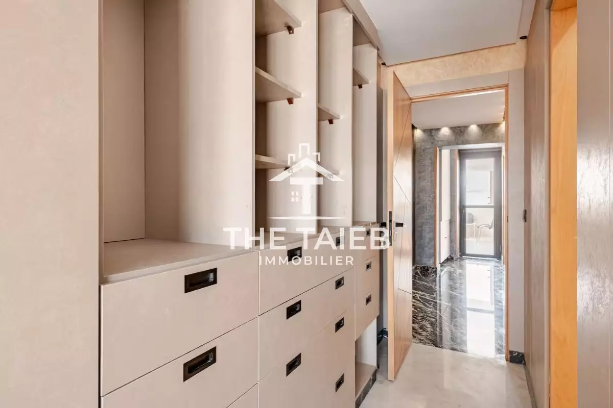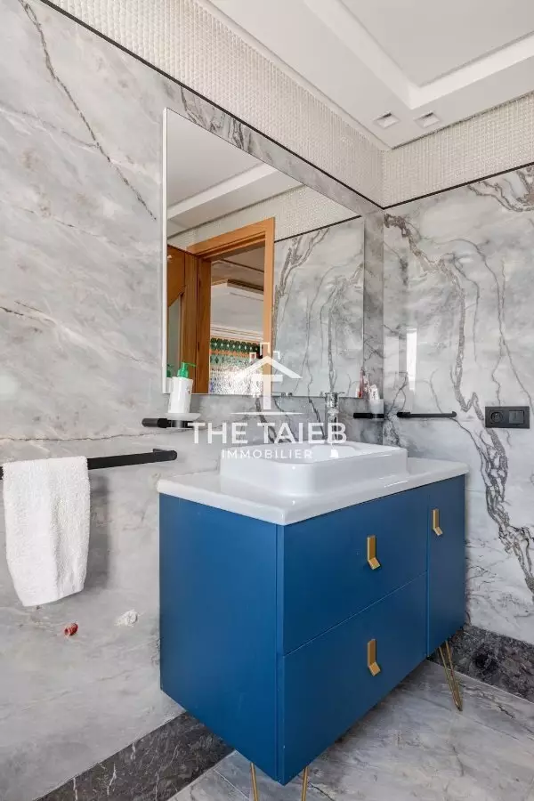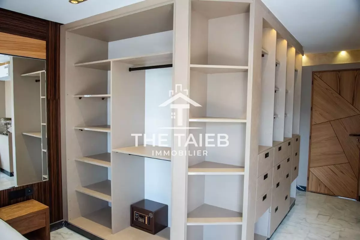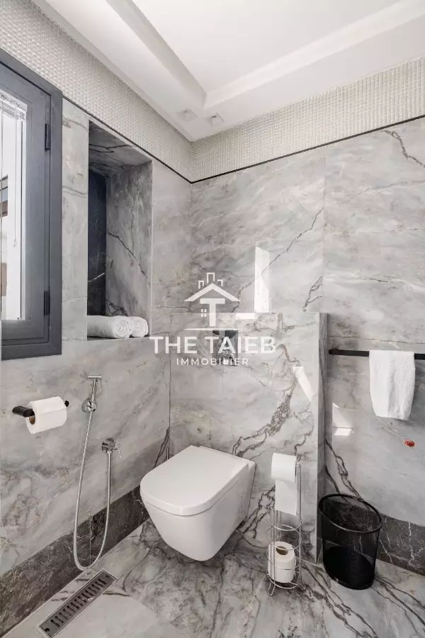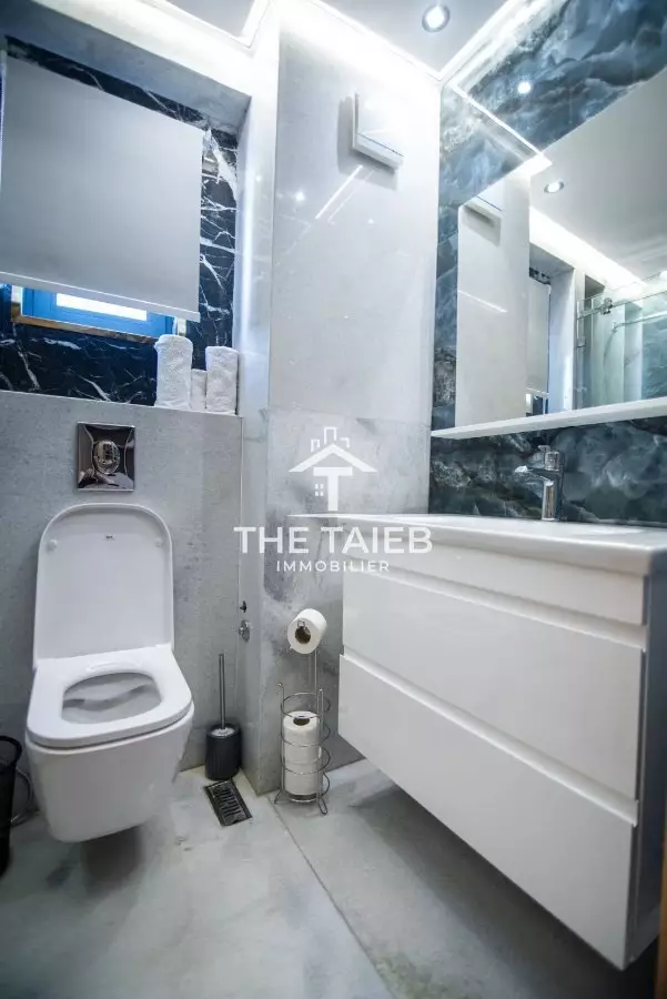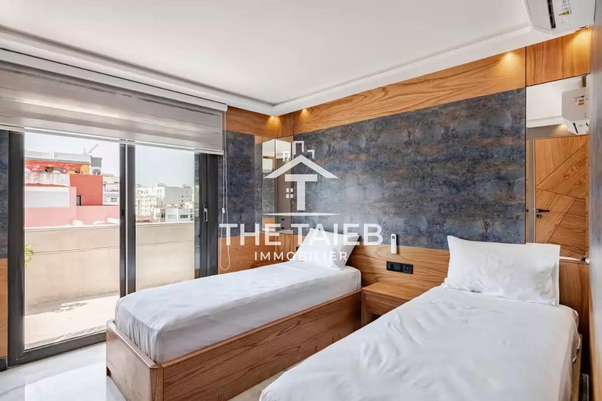 THE TAIEB IMMOBILIER vous présente une appartement Située au 9 -ème et dernier étage. * 3 Terrasses à 360 degré. * Deux suite parentales et une chambre d'enfants. * Un salon à coupé le souffle avec zellij beldi création unique donnant sur deux terrasse des deux cotés et un comptoir de cuisine en bois massif. * Jacuzi dans la salle de bain visiteurs. * A 1 minute de la plage, des (Restaurants , bar .....) * A 10 minutes de la gare du train, de la marina et du centre ville. * A 10 minutes du port de tanger ville par taxi. Le logement À l’intérieur, il comprend deux chambres semblables à des suites royales, chacune équipée d’une salle de bain privative, ainsi qu’une chambre moderne et chaleureuse, idéale pour des enfants ou des invités. Les chambres, entièrement climatisées, sont dotées de murs habillés en bois naturel et d’un éclairage tamisé. Toutes s’ouvrent sur la terrasse grâce à de grandes portes vitrées coulissantes, offrant une vue exceptionnelle. La pièce de vie principale est un chef-d’œuvre avec un salon décoré de zellige traditionnel moderne et un comptoir-bar en bois naturel, ajoutant une touche d’élégance. La cuisine américaine, parfaitement intégrée, est équipée d’appareils électriques haut de gamme et de haute qualité, conçue pour allier esthétique et fonctionnalité. Le sol de l’appartement est une véritable œuvre d’art en marbre noir aux veines blanches harmonieuses. Une salle de bain pour invités propose un jacuzzi pour deux personnes, avec une ventilation naturelle et une excellente exposition au soleil. L’appartement bénéficie également d’une lumière naturelle exceptionnelle, baignant chaque pièce de six heures du matin à cinq heures de l’après-midi, sans nécessiter d’éclairage artificiel.