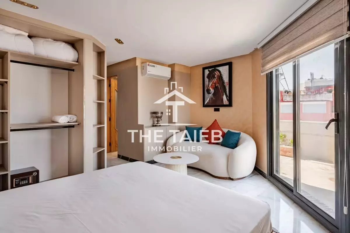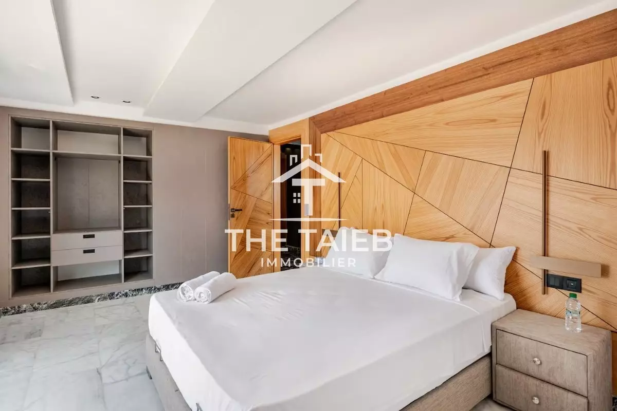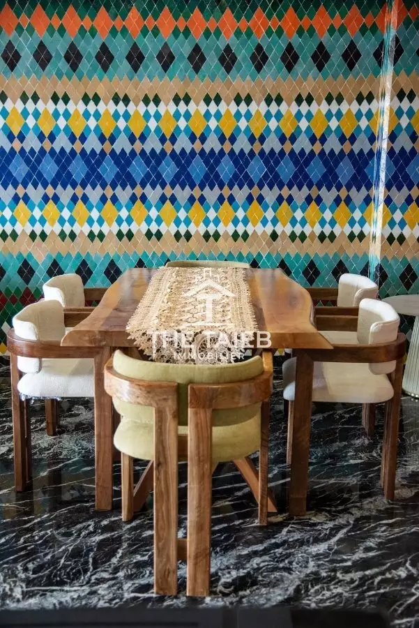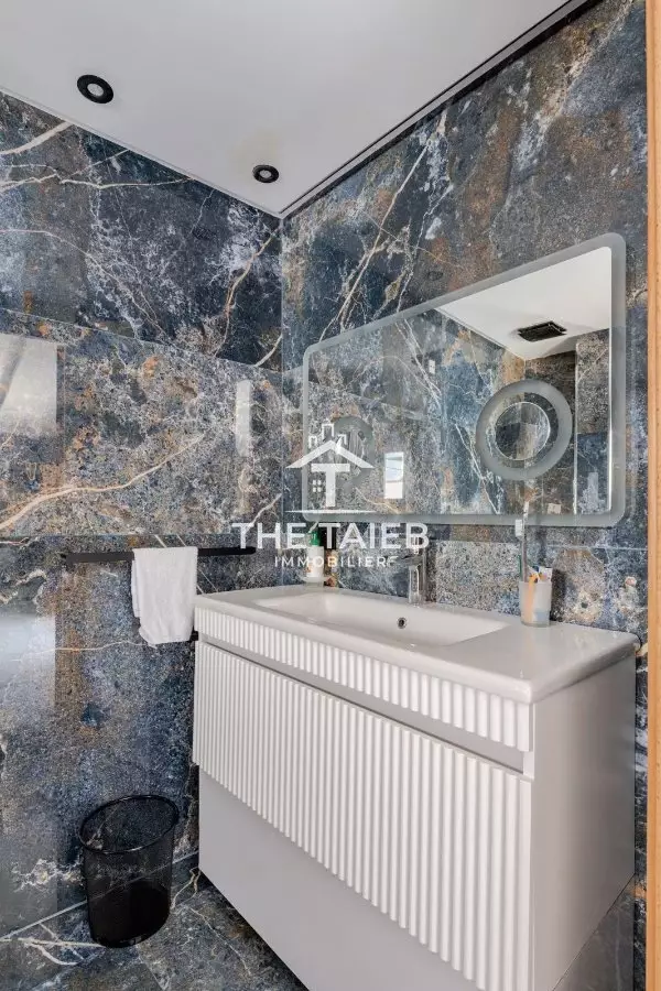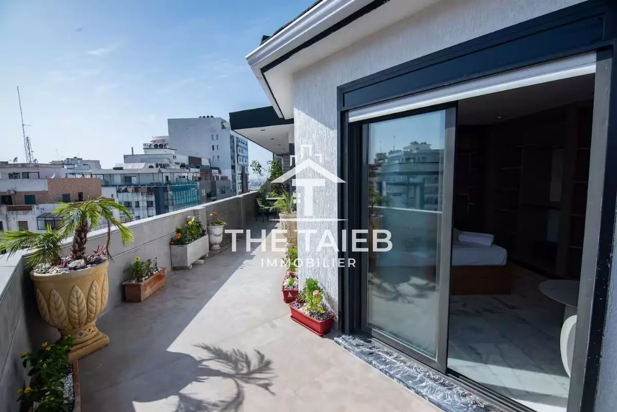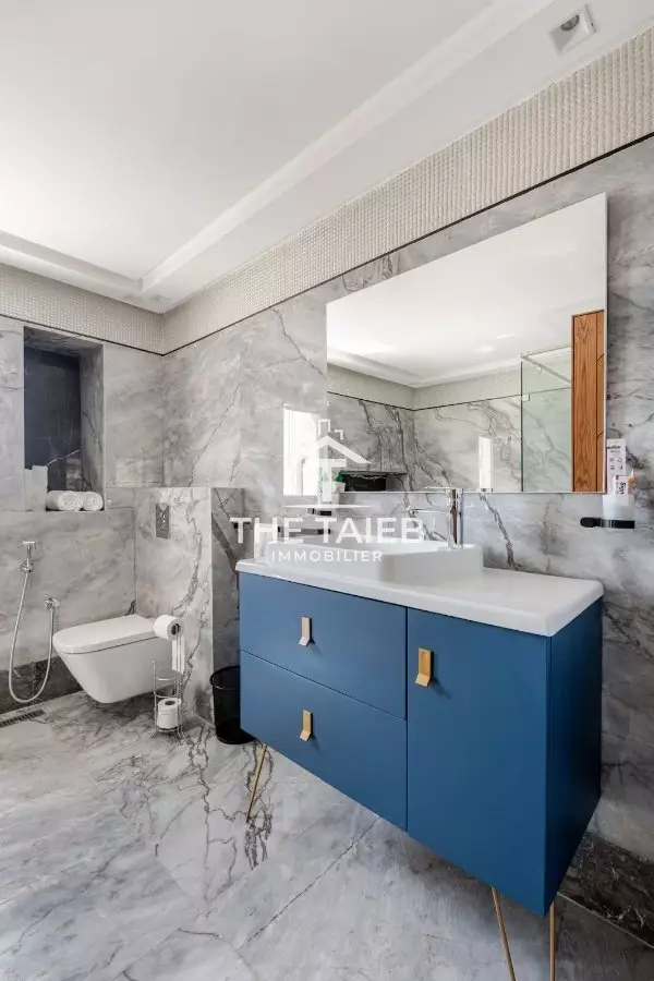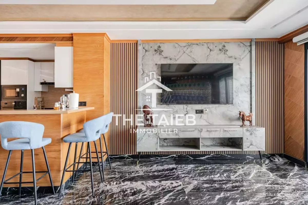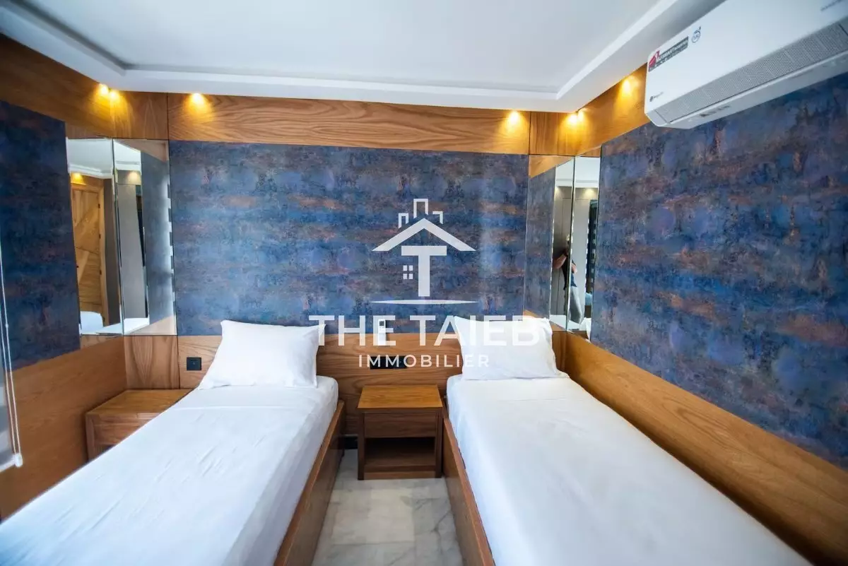 THE TAIEB IMMOBILIER vous présente une appartement Située au 9 -ème et dernier étage. * 3 Terrasses à 360 degré. * Deux suite parentales et une chambre d'enfants. * Un salon à coupé le souffle avec zellij beldi création unique donnant sur deux terrasse des deux cotés et un comptoir de cuisine en bois massif. * Jacuzi dans la salle de bain visiteurs. * A 1 minute de la plage, des (Restaurants , bar .....) * A 10 minutes de la gare du train, de la marina et du centre ville. * A 10 minutes du port de tanger ville par taxi. Le logement À l’intérieur, il comprend deux chambres semblables à des suites royales, chacune équipée d’une salle de bain privative, ainsi qu’une chambre moderne et chaleureuse, idéale pour des enfants ou des invités. Les chambres, entièrement climatisées, sont dotées de murs habillés en bois naturel et d’un éclairage tamisé. Toutes s’ouvrent sur la terrasse grâce à de grandes portes vitrées coulissantes, offrant une vue exceptionnelle. La pièce de vie principale est un chef-d’œuvre avec un salon décoré de zellige traditionnel moderne et un comptoir-bar en bois naturel, ajoutant une touche d’élégance. La cuisine américaine, parfaitement intégrée, est équipée d’appareils électriques haut de gamme et de haute qualité, conçue pour allier esthétique et fonctionnalité. Le sol de l’appartement est une véritable œuvre d’art en marbre noir aux veines blanches harmonieuses. Une salle de bain pour invités propose un jacuzzi pour deux personnes, avec une ventilation naturelle et une excellente exposition au soleil. L’appartement bénéficie également d’une lumière naturelle exceptionnelle, baignant chaque pièce de six heures du matin à cinq heures de l’après-midi, sans nécessiter d’éclairage artificiel.